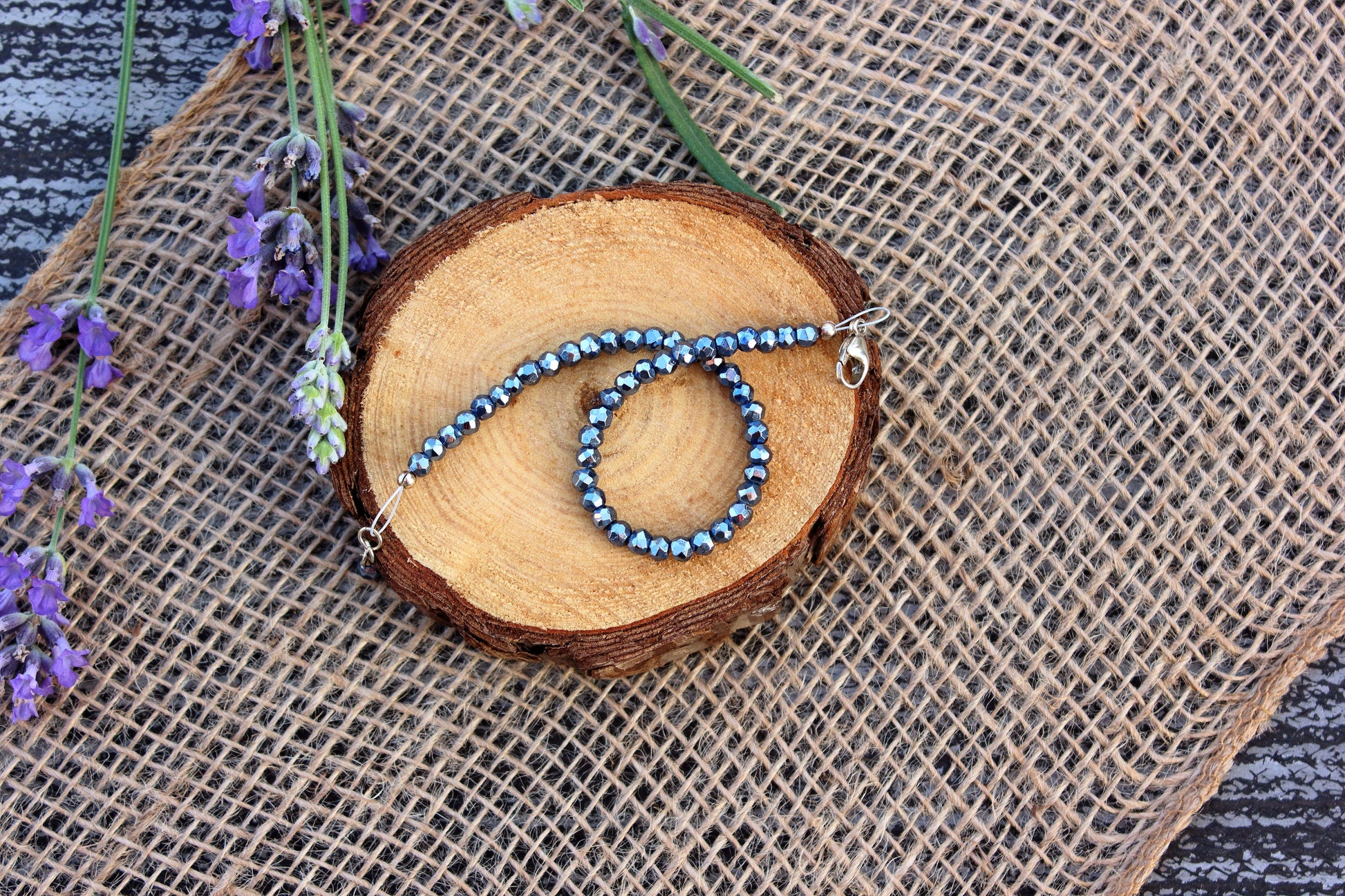 This Blue Pyrite faceted bracelet features faceted blue pyrite bracelet strung on a nylon chord and finished with sterling silver bead caps, extension rings, and a delicate sterling silver clasp. Also known as fools gold, this blue bracelet shines with its metallic glow.