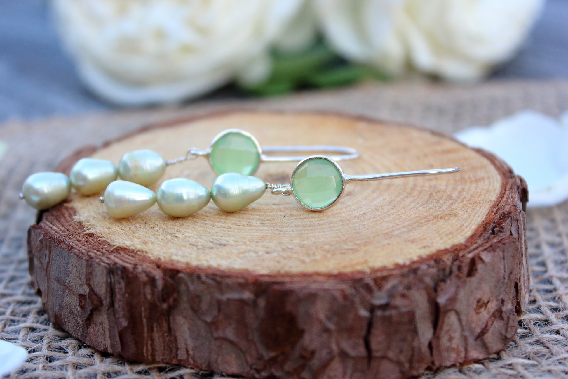 These Green Chalcedony and Pearl Earrings feature Green faceted Chalcedony bezel-set silver plated ear wires with green freshwater pearl dangles on sterling silver head pins.