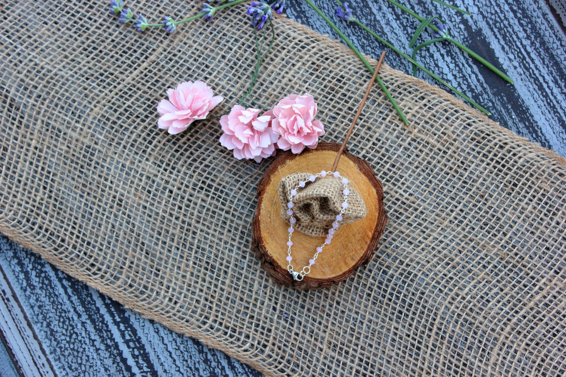 This Rose Quartz rosary chain bracelet features rose quartz beads, faceted and wire-wrapped with sterling silver plated wire and finished with a delicate sterling silver clasp.