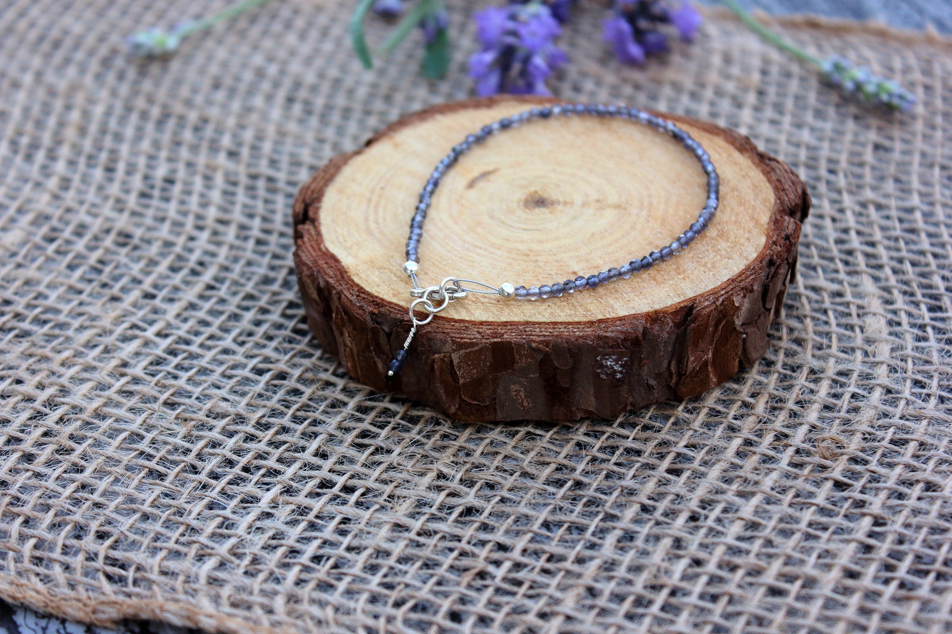 This Tanzanite faceted bracelet features faceted Tanzanite beads strung on a nylon chord and finished with sterling silver bead caps, extension rings, and a delicate sterling silver clasp. Two Tanzanite beads on a wire-wrapped sterling silver head-pin at the end of the extension rings adds a finishing touch.
